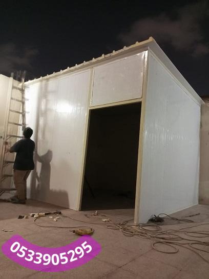- تركيب جدران الغرفة بنظام عاشق ومحب مصنوع من ألواح سماكة 10 سم مغلفة من الداخل والخارج صاج مجلفن بسمك 0.5 مم، وتثبت الحوائط بالأرضية بواسطة صاج مجلفن على شكل حرف U، حيث يتم تثبيتها بالأرضية بواسطة مثبتات ومسامير مناسبة لذلك.